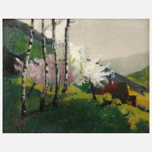 blühende Kirschbäume mit Birken, an einem Hang vor einsamem Haus, lichtdurchflutete Landschaftsmalerei mit teils pastosem Farbauftrag, Öl auf leinenkaschierter Pappe, um 1920–30, rechts unten im Bereich des Falzes undeutliches Monogramm, rückseitig in Blei bezeichnet oder signiert "H. Köck", gerahmt, Falzmaße ca. 19 x 23 cm.