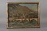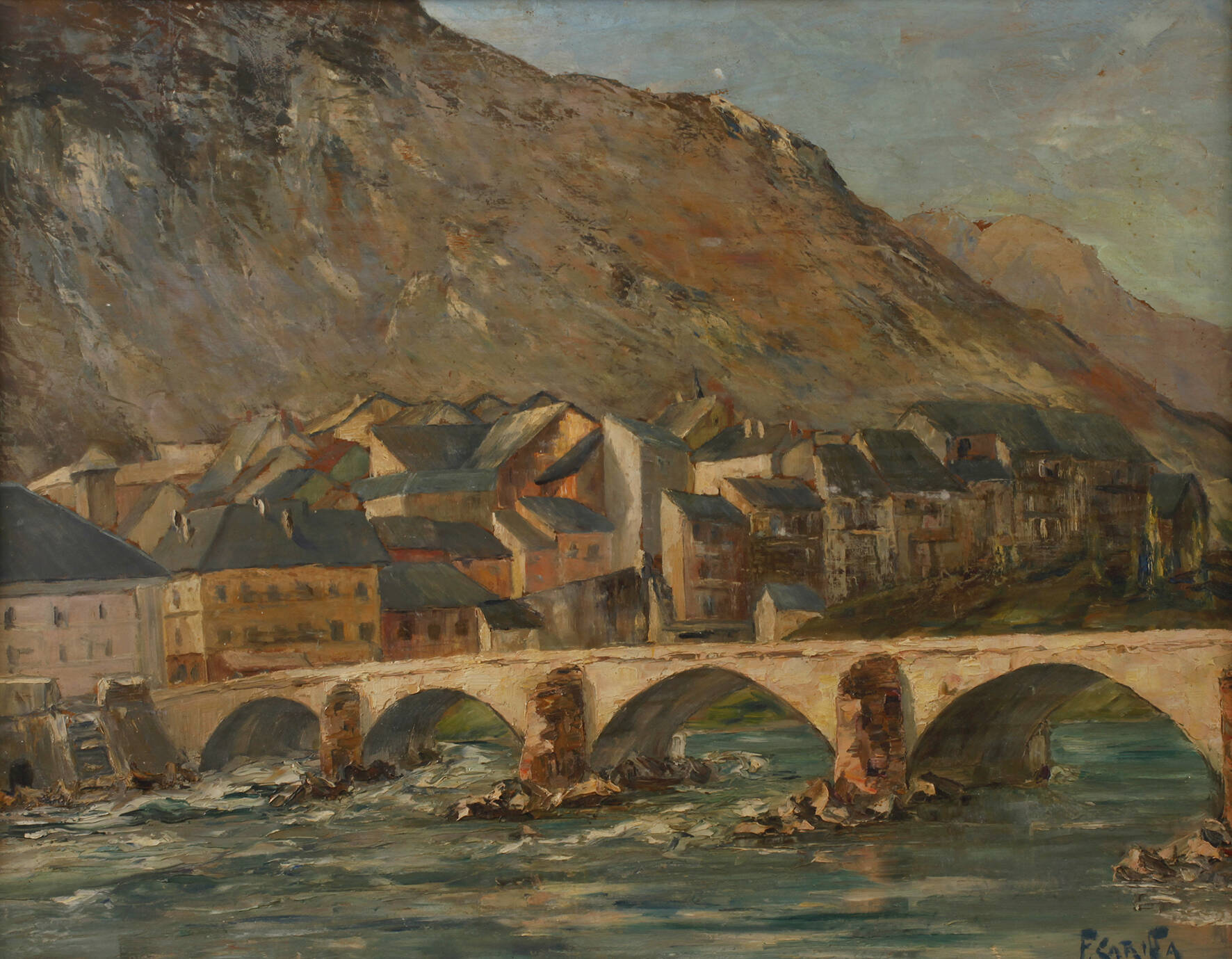 sommerlicher Blick über Fluss mit alter Steinbogenbrücke, zur Stadtkulisse am Fuße hoch aufragender Berge, im hellen Sonnenlicht, pastose impressionistische Malerei mit breitem Pinselduktus, teils in Spachteltechnik, Öl auf Sperrholzplatte, 1. Hälfte 20. Jh., rechts unten undeutlich wohl "F. Gafa" oder "F. Safa" signiert, gering restaurierungsbedürftig, original gerahmt (bestoßen), Falzmaße ca. 50,5 x 65 cm.