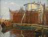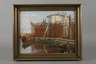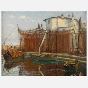 Blick übers Hafenbecken mit Fischerkähnen, zum Trockengerüst mit aufgehängten Fischernetzen, vor mediterraner Stadtkulisse im hellen Sonnenlicht, gering pastose, kontemplative Malerei in sublimer Farbigkeit, Öl auf Leinwand und Karton, rechts unten monogrammiert und datiert "CR.1928.", rückseitig bezeichnet "Abazzia [sic!]" gemeint ist das Seebad Abbazia oder Opatija bzw. Sankt Jakobi an der Kvarner-Bucht in Istrien, gering reinigungsbedürftig, gerahmt, Falzmaße ca. 39 x 50 cm.