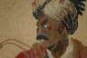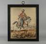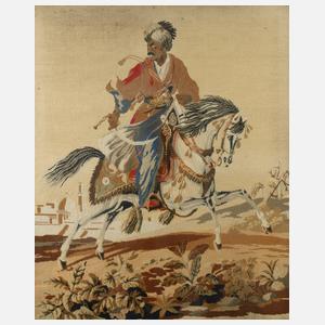 Mitte 19. Jh., polychrome Stickerei in Erdtönen, großformatige Darstellung eines osmanischen Reiters in angedeuteter Landschaft mit weiterem Reiter und Stadtsilhouette im Hintergrund, auf Keilrahmen alt hinter Glas in breiter schwarzer Lackleiste mit großem Messingring gerahmt, guter altersgemäßer Zustand, Leiste minimal bestoßen und Hinterfütterung eingerissen, Maße Bildausschnitt ca. 81x 68 cm.