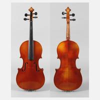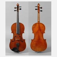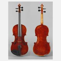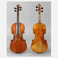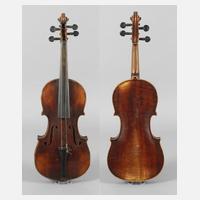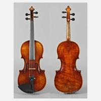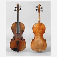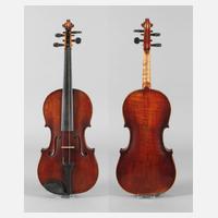auf Klebezettel bezeichnet Antonius Stradiuarius Cremonensis Faciebat Anno 172?, Sächs. Musikinstrumenten-Manufactur Schuster & Co., Markneukirchen in Sachsen 1891, geteilter, sehr gleichmäßig geflammter Boden in hellem, braun-gelbem Lack auf altgelbem Grund, dreiteilige umlaufende Randeinlage, Decke mit leichtem Riss rechts neben dem Kinnhalter, Alters- und Gebrauchsspuren, im Etui, L Korpus 36 cm.