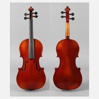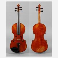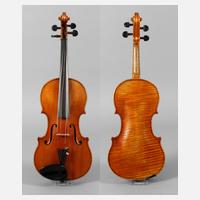 auf Klebezettel bezeichnet Fritz Mönnig Geigenbauer Markneukirchen/Sa. anno 1956, Modell nach A. Stradivari, ungeteilter, ungeflammter Boden in orange-rotem Lack auf gelbem Grund, dreiteilige umlaufende Randeinlage, Boden und Zarge aus Vogelaugenahorn, rissfreie Decke, guter, spielbereiter Zustand, leichte Alters- und Gebrauchsspuren, im Etui, L Korpus 35,7 cm.