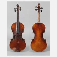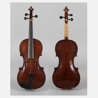 auf Klebezettel bezeichnet Aug. Clemens Glier Markneukirchen i. Sa. 1824, des Weiteren Brandstempel A.C.G. sowie Reparaturzettel F. E. Stamm Hamburg 1880, ungeteilter Boden sowie Zarge aus Vogelahorn, kirschroter Lack über altgelbem Grund, rissfreie Decke aus breiter Resonanzfichte, Hals angeschäftet mit kleiner Schnecke, spielbereiter, restaurierter Zustand, mit Bogen, im Etui, dieser gemarkt Tourte, runde Stange aus Fernambukholz mit Montierungen aus Silber und Perlmutt, L Korpus 35,7 cm.