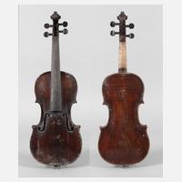 Anfang 20. Jh., ohne Zettel, geteilter, unregelmäßig geflammter Boden in bernsteinfarbenem Lack, dreiteilige umlaufende Randeinlage, Decke mit Rissbildung, Stimme lose, zwei Wirbel fehlen, ohne Bespannung, stärkere Alters- und Gebrauchsspuren, restaurierungsbedürftig, L Korpus 36,1 cm.