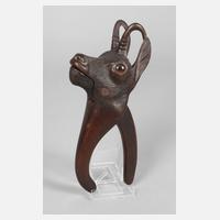 um 1900, wohl Bregenzer Schnitzerei, Nussknacker in Form eines Gamskopfes, aus gefärbtem Hartholz, mit originalen Glasaugen, guter Zustand, H ges. 23 cm.