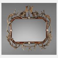 um 1900, achteckiger Rahmen aus massivem Nussbaum, verziert mit vier fein geschnitzten Hirschhornrosen, umgeben von Trophäen von Hirsch, Dammwild, Rehbock und Mufflon, guter Originalzustand mit Altersspuren, Maße 138 x 136 cm.