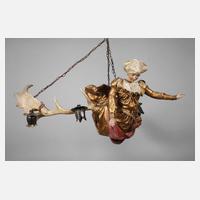 Ende 19. Jh., Holz geschnitzt, kreidegrundiert, farbig gefasst und teils reich vergoldet, in mittelalterliche Tracht gekleidete junge Frau mit ausgebreiteten Armen, die beiden montierten Damwildschaufeln tragen jeweils zwei Kerzentüllen, an drei Gliederketten abgehängt, gute Erhaltung, L ca. 90 cm.