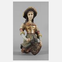 Ende 19. Jh., Holz geschnitzt, kreidegrundiert, farbig gefasst und gold- bzw. silberbronziert, weibliche Gestalt in antikisierender Tracht, mit Schild und fehlender Tülle, an zarter Gliederkette abgehängt, kleinste Substanzverluste, Altersspuren, H 45 cm.
