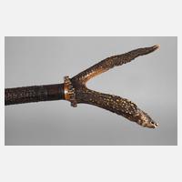 20. Jh., Gabel aus Hirschhorn, ein Ende mit einem Wildschweinkopf beschnitzt, Schaft aus gefärbtem Hartholz, durchgehend in Noppentechnik gearbeitet, mittig zerlegbar, guter Zustand, wohl Unikat L ges. ca.156 cm.