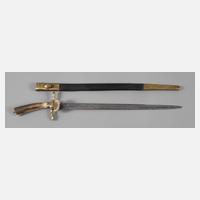 um 1900, schwere Keilklinge, einseitig doppelt gekehlt, die andere Seite mit flüchtendem Wildschwein unter ornamentalen Mustern geätzt, Parierstange aus Horn, darüber das Sächsische Wappen, auf der Gegenseite zwei Schwerter im Wappenschild, geschnitzter Griff in Form eines Hirschkopfes aus Nussbaum, guter Zustand, L ges. 50 cm.