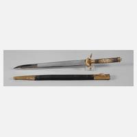 um 1920, verzierter Horngriff mit Schriftzug "Dem Deutschen Weidwerk", Rückseitig flüchtendes Wildschwein, Kugelknauf, Parierstange in Form gegenläufiger Hufe und Stichblatt in Muschelform vergoldet, Lederscheide mit ebenfalls vergoldetem Mundblech und Ortband, einfache, stumpfe Keilklinge (wohl ersetzt), guter Zustand, L ges. 60 cm.