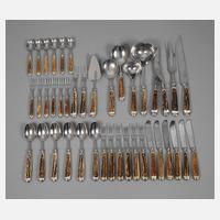 2. Hälfte 20. Jh., Edelstahl Rostfrei Germany, Griffe aus Horn, für sechs Personen, bestehend aus Speisemessern, Speisegabeln, Speiselöffeln, Kuchengabeln, Dessertlöffeln sowie zehn Vorlegeteilen, guter Zustand, L max. 33,5 cm.