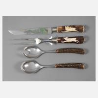 20. Jh., Metallteile gemarkt "Rostfrei", "Solingen seit 1906 Stainless" bzw. "Stainless Germany", Tranchiermesser, Tranchiergabel mit Schutz sowie zwei große Vorlegelöffel, jeweils mit Hirschhorngriffen, teilweise mit jagdlichen Motiven beschnitzt, Klinge des Messers mit geätzten Jagdmotiven, gute unbeschädigte Erhaltung, L max. 32,7 cm.
