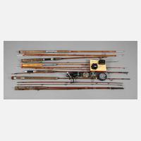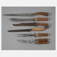 1. Hälfte 20. Jh., alle mit Griffstücken aus Hirschhorn, dabei zwei Vorlegeteile, Geflügelschere und drei Messer, Alters- und Korrosionsspuren, L max. 44 cm.
