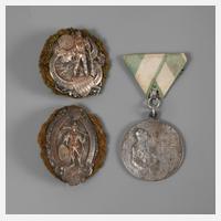 1920er Jahre, zwei gemarkt Zeichenfabrik Lindner München, Metall versilbert, alle als Spange gearbeitet, Altersspuren, L max. 8 cm.