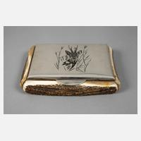 Anfang 20. Jh., flache Dose, umlaufend verziert von Hirschhornelementen, der scharnierte Silberdeckel mit graviertem Rehbockhaupt, leichte Altersspuren, Maße 4 x 18 x 14 cm.