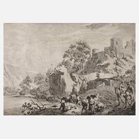 gebirgige Landschaft mit einer über einen See oder Fluss thronenden Burgruine und Figurenstaffage im Vordergrund, Radierung, um 1600, links unten in der Platte bezeichnet "v. Aken inve et fecit", unter Passepartout montiert, bis an die Umfassungslinie beschnitten, hinterlegter Einriss, leichte Altersspuren, Maße ca. 18,3 x 25 cm. Künstlerinfo: wurde nach der Geburtsstadt seines Vaters "Aachen" genannt, auch Johann von Aachen, Jan van Achen, Aken, Janachen, Fanachen, Abak, Jean Dac und Aquano, van Acken, dt. Maler, Zeichner, Kupferstecher und Diplomat (1552 Köln bis 1615 Prag), Ausbildung zum Maler wohl beim flämischen Maler E. Jerright in Köln, ab ca. 1573 Studienreise nach Italien, in Venedig tätig für den Antwerpener Kunsthändler Gaspar Rem, anschließend in Rom bei Anthonis Santvoort, Aachen knüpfte in Italien zahlreiche Kontakte und wurde ab 1580 ein geschätzter Maler, ab 1585 tätig für den Großherzog Francesco I. de’ Medici in Florenz, 1588 Rückkehr nach Köln, ab 1590 in München für Herzog Wilhelm V. von Bayern tätig, erhielt Aufträge der Augsburger Fugger, 1592 Berufung zum Hof- und Kammermaler Kaiser Rudolf II. mit Wohnsitz in München, 1594 Erhebung in den Adelsstand durch Rudolf II., 1596 oder 1601 Übersiedlung nach Prag, 1605 Erteilung des Schutzbriefes "Salva Guardia" durch Rudolf II., nach dessen Tod Hofmaler seines Nachfolgers Kaiser Matthias, Quelle: Thieme-Becker, AKL, Saur "Bio-Bibliographisches Künstlerlexikon", Müller-Singer, Seubert, Müller-Klunzinger, Nagler und Wikipedia.