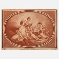 Venus, umgeben von Putti und jungen Frauen beim Ankleiden, sich im Spiegel betrachtend, unter der Darstellung betitelt "Venus a sa Toilettes", Crayonmanier, Mitte 18. Jh., links unten bezeichnet "F. Boucher delin" (hat gezeichnet), etwas fleckig und angestaubt, Darstellungsmaße ohne Schrift ca. 20,5 x 28,5 cm, Blattmaße ca. 22,5 x 30 cm. Künstlerinfo: frz. Maler, Zeichner und Kupferstecher des Rokoko (1703 Paris bis 1770 ebenda), ab 1720 Schüler von François Lemoyne und Jean Cars, vierjähriger Romaufenthalt, ab 1731 Mitglied der königlichen Akademie, seit 1734 für das frz. Königshaus tätig und Günstling der Marquise de Pompadour, 1742 Ernennung zum Hofmaler, ab 1755 künstlerischer Leiter der königlichen Tapisserie-Manufaktur, ab 1761 Rektor der königlichen Akademie, 1765 Ernennung zum ersten Hofmaler des Königs, Quelle: Thieme-Becker und Wikipedia.