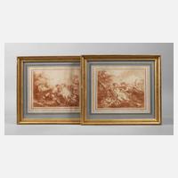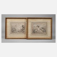 jeweils Satyre, junge Frauen begehrend, umgeben von spielenden Kindern, Crayonmanier, Mitte 18. Jh., unter der Darstellung rechts bezeichnet "Gravé par Demarteau" und links "Peint et dessiné par Caresme Peintre de Roi", leicht gebräunt, unter Passepartout und hinter Glas gerahmt, Darstellungsmaße ohne Schrift ca. 19,7 x 23,6 cm. Künstlerinfo: frz. Kupferstecher, Radierer und Verleger (1722 Lüttich bis 1776 Paris), Lehre bei seinem Vater (Waffenschmied) als Metallgravur und Goldschmied, ab 1746 Meister in Paris, 1755 Gründung einer Stecherwerkstatt mit Kunstverlag, zwischen 1757–59 Entwicklung einer Methode, um Drucke in der Optik der Kreidezeichnung herzustellen, ab 1769 Mitglied der Akademie, 1770 Ernennung zum Graveur du Roy durch König Ludwig XV. von Frankreich, Quelle: Thieme-Becker und Wikipedia.