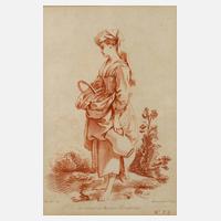 stehende junge Frau mit Weidenkorb und Wasserkanne, nach einer Vorlage von François Boucher, Crayonmanier um 1760, unter der Darstellung bezeichnet rechts "Demarteau l´né. Sculp." und links "Boucher del.", leicht gebräunt, unter Passepartout und hinter Glas in Berliner Leiste (leichte Altersspuren) gerahmt, Passepartoutausschnitt ca. 21,5 x 15 cm. Künstlerinfo: frz. Kupferstecher, Radierer und Verleger (1722 Lüttich bis 1776 Paris), Lehre bei seinem Vater (Waffenschmied) als Metallgravur und Goldschmied, ab 1746 Meister in Paris, 1755 Gründung einer Stecherwerkstatt mit Kunstverlag, zwischen 1757–59 Entwicklung einer Methode, um Drucke in der Optik der Kreidezeichnung herzustellen, ab 1769 Mitglied der Akademie, 1770 Ernennung zum Graveur du Roy durch König Ludwig XV. von Frankreich, Quelle: Thieme-Becker und Wikipedia.