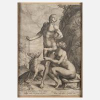 der nackte Adonis mit zwei Hunden an der Leine, neben einer nackten jungen Frau in Phantasielandschaft, Kupferstich, Anfang 17. Jh., links unten in der Darstellung bezeichnet "Lucas Kilian Aug. sculpsit Aug. Vindel exudit Dominic Custos", unter der Darstellung, in der Platte lateinischer Text, rechts unten handschriftliche Nummer "158.", auf Papier aufgezogen, etwas fleckig und leicht angeschmutzt, an der rechten Blattkante teils in der Darstellungslinie beschnitten, hinter Glas gerahmt, Darstellungsmaße ohne Schrift ca. 36 x 26,5 cm, Blattmaße ca. 38 x 26,8 cm. Künstlerinfo: auch Lukas Kilian, dt. Zeichner und Kupferstecher (1579 Augsburg bis 1637 Augsburg), Sohn des Goldschmieds Bartholomäus Kilian, ging bei seinem Stiefvater Dominicus Custos in die Lehre, 1601–04 Aufenthalt in Italien, ab 1611 Mitglied des Großen Rats zu Augsburg, Quelle: Thieme-Becker und Wikipedia.