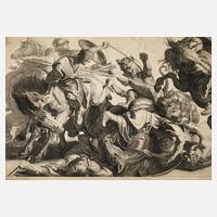 dramatische Kampfesszene von mehreren Reitern mit Waffen gegen einen Löwen und einen Bären, großformatiger Stich nach einer Vorlage von Peter Paul Rubens, Kupferstich kaschiert, Mitte 17. Jh., unter der Darstellung in der Platte bezeichnet rechts "WLeeuw fec. und links "P. P. Rubens invent", rückseitig bezeichnet "Leeuw, Willem de, Antwerpen 1603 Hauptblätter Stiche nach Rubens sehr selten!", bis an die Darstellung beschnitten, vornehmlich im Randbereich Erhaltungsmängel, Blattmaße ca. 44,5 x 63,5 cm. Künstlerinfo: holl. Kupferstecher und Radierer (1603 Antwerpen bis ca. 1665), wohl Schüler von P. Soutman in Antwerpen, stach nach Rubens und Rembrandt, Quelle: Thieme-Becker und Internet.