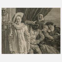 teils maskierte und verkleidete Männer neben einer musizierenden Dame und einem Herrn, Kupferstich, Mitte 18. Jh., rückseitig Zuschreibung "Kupferstich von L. Surugne nach A. Watteau Paris, um 1750", um die Darstellung schmales Papierrändchen, in Passepartout (fleckig) freigestellt und hinter Glas gerahmt, Darstellungsmaße ca. 18,5 x 22,8 cm.