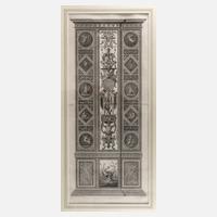 großformatige Darstellung eines üppig verzierten und bemalten Pilasters in den Loggien des Vatikans, Kupferstich auf zwei Bögen Papier, unter der Darstellung im Druck bezeichnet und datiert rechts "Joannes Volpato sculp. Romae 1776" und links "Ludovicus Teseo Taurinensis delin.", minimal fleckig, unter Passepartout und hinter Glas gerahmt, Darstellungsmaße ca. 101 x 47 cm. Künstlerinfo: auch Johannes Volpato, italienischer Radierer (1733 Bassano bis 1803 Rom), Lehre als Steinmetz, 1760–62 Schüler an der Calcografia Remondini in Bassano, folgte anschließend Bartolozzi nach Venedig, ab 1772 in Rom ansässig, betrieb hier auch eine Schule für Kupferstich, 1786 gründete er in Via Pudenziana eine Porzellanfabrik, Papst Pius verlieh ihm das Privileg der Nachbildung von Altertümern, Quelle: Thieme-Becker und Internet.