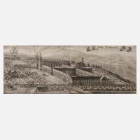 vielfigürliche Szene der "Glorreichen Revolution [Glorious Revolution]" aus dem Jahre 1688, der protestantische, dem Haus Oranien-Nassau entstammende, Prinz Wilhelm III. (1650–1702) residierte als Statthalter der Niederlande, er war der Neffe des regierenden Königs von England Karl II., als dieser 1685 kinderlos starb, folgte dessen Bruder Jacob II. auf den Thron, Wilhelm III. war mit Jacobs Tochter Maria II. verheiratet, nachdem sein Schwiegervater Jacob II. zum Katholizismus übergetreten war und zunehmend den Einfluss der protestantischen Kirche zurückdrängte, wandte sich das englische Parlament hilfesuchend an Wilhelm von Oranien, Wilhelm entmachtete daraufhin zum Jahresende 1688, nach einer militärischen Intervention, seinen Schwiegervater und zog als Sieger in London ein, die aus der Vogelschau aufgenommene Szene zeigt die Ankunft der Wagenkolonne Wilhelms, rechts im Vordergrund feiernde Menschen und Salut schießende Soldaten vor der Kulisse von London mit der Themse, großformatige Radierung auf Bütten, aus dem von Matthäus Merian begründeten Geschichtswerk "Theatrum Europaeum", um 1690, unsigniert, über der Darstellung Schriftband "Einzug Wilhelmi Henrici Prinzen von Orange zukunfftigen Königs in England etc.: in London", Blattränder außerhalb der Darstellung partiell restauriert, geringe Altersspuren, im Passepartout, ungerahmt, Plattenmaß ca. 30 x 36 cm.