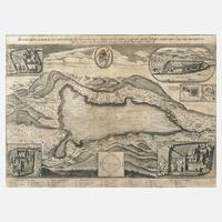 Blick auf den teils von Bergen umgebenen Tegernsee, in den Ecken vier Ansichten, unter anderem vom Kloster Tegernsee, oben mittig Wappen, unter der Darstellung Legende, Kupferstich, Mitte 17. Jh., mittig übliche Faltlinie, gebräunt, im Bereich des Wappens brauner Fleck, unter Passepartout und hinter Glas gerahmt, Darstellungsmaße ohne Legende ca. 26,5 x 38,7 cm. Künstlerinfo: schweiz. Kupferstecher, Buchhändler und Verleger (1593 Basel bis 1650 Schwalbach), 1606–09 Schüler des Kupferstechers Dietrich Meyer und des Glasmalers Christof Murer in Zürich, 1610 bei Friedrich Brentel in Straßburg, 1625 Übernahme der Kunsthandlung seines Schwiegervaters Johann Theodor de Bry in Frankfurt am Main, nach seinem Tod führten seine Söhne Matthäus der Jüngere und Caspar sowie später deren Nachkommen den Verlag unter der Bezeichnung ”Merians Erben” bis 1727 weiter und vervollständigten seine Hauptwerke ”Topographia Germaniae” und ”Theatrum Europaeum”, Quelle: Thieme-Becker und Internet.