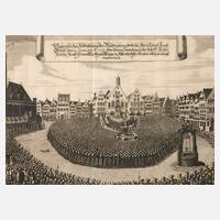 Blick auf den Römer während der Huldigung des Königs am 9. Januar 1752, oberhalb der Darstellung Spruchband, Kupferstich, 2. Hälfte 18. Jh., zwei leichte Faltlinien, unter Passepartout und hinter Glas gerahmt, Passepartoutausschnitt ca. 26 x 35 cm.