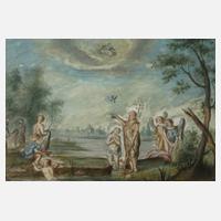 fein erfasste biblische Szene der Taufe Jesu durch Johannes, in Gegenwart von Engeln, während der Heilige Geist in Gestalt einer Taube auf Jesus hernieder sinkt, scheint Gottvater vom Himmel aus der Zeremonie beizuwohnen, hierzu schreibt die Bibel "... Und als Jesus getauft war, stieg er alsbald herauf aus dem Wasser. Und siehe, da tat sich ihm der Himmel auf, und er sah den Geist Gottes wie eine Taube herabfahren und über sich kommen. Und siehe, eine Stimme aus dem Himmel sprach: "Dies ist mein lieber Sohn, an dem ich Wohlgefallen habe." ...", Schmidt schuf über 1000 Ölgemälde meist religiösen Inhalts, 1773 schuf er unter anderem ein Altargemälde "Die Taufe Christi im Jordan" für die Abteikirche Sonntagberg, welches er eigenhändig radierte (vgl. Nagler), miniaturhafte Mischtechnik auf Pergament, unsigniert, rückseitig altes Etikett mit Zuschreibung an "... Kremser Schmid?" sowie weitere unleserliche Annotationen, Altersspuren, hinter Glas alt gerahmt, Falzmaße ca. 13 x 18 cm. Künstlerinfo: genannt nach seiner Herkunft "Kremser Schmidt", irrtümlich auch Martin Joachim Schmidt, österreichischer Barockmaler, Zeichner und Radierer sowie Plattenhändler (1718 Grafenwörth bei Krems an der Donau bis 1801 Stein an der Donau), Sohn des Bildhauers Johannes Schmidt, zunächst Schüler seines Vaters und zum Bildhauer bestimmt, schließlich Hinwendung zur Malerei und fünf Jahre Schüler von Johann Gottlieb Starmayr, mit dem er 1740-41 den Ratssaal zu Retz ausmalte, parallel autodidaktische Studien alter Meister, hier beeinflusst von der Malerei von Jacob van Schuppen, Franz Anton Maulbertsch, Rembrandt van Rijn sowie der Freskanten Daniel Gran und Paul Troger, als Radierer schuf er Arbeiten in der Art von Giovanni Benedetto Castiglione und Rembrandt, ab 1741 in Krems, Ortsteil Stein, an der Donau freischaffend, betrieb hier parallel einen Handel mit Kelheimer Platten, schuf neben ca. 1000 Gemälden vor allem Kirchenausstattungen und Altarbilder in Krems, Brünn [Brno], Linz, Salzburg, Wien, Graz, Obrowitz [Zábrdovice, heute zu Brno], Melk, Göttweig und Seitenstetten, 1768 Ernennung zum Mitglied der Wiener Akademie, unterhielt ab den 1760er Jahren eine Werkstatt, die ihn bei der Ausführung seiner Gemälde unterstützte, Quelle: Thieme-Becker, Saur "Bio-Bibliographisches Künstlerlexikon", Nagler, Müller-Singer, Seubert, Müller-Klunzinger, Füssli, Fuchs, Bénézit, Neue Deutsche Biographie, Allgemeine Deutsche Biographie, Wurzbach und Wikipedia.