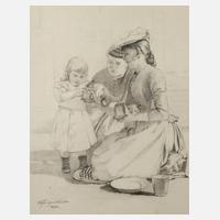 Mutter, ihrer Tochter junge Katzen reichend, währenddessen die Großmutter das Treiben beobachtet, Bleistiftzeichnung, links unten signiert und datiert "E A Fischer-Cörlin 1893", gezeichnetes Raster schwach erkennbar, minimal braunfleckig, unter Passepartout und hinter Glas gerahmt, Passepartoutausschnitt ca. 28 x 22 cm. Künstlerinfo: eigentlich Ernst Albert Fischer, auch Fisher-Coerlin (oder Cöerlin), dt. Historienmaler, Grafiker, Illustrator und Buchschmuckkünstler sowie Schöpfer von Innenraumdekorationsmalerei (1853 Cörlin/Pommern bis 1932 Berlin), Studium an der Kunstakademie in Berlin bei Eduard Daege und Julius Friedrich Anton Schrader, nachfolgend 6 Jahre Meisterschüler bei Anton von Werner, 1877–92 Beteiligung an den Ausstellungen der Berliner Akademie, ab 1893 Teilnahme an der Großen Berliner Kunstausstellung, Mitglied der Allgemeinen Deutschen Künstlergenossenschaft und Mitglied im Verband Deutscher Illustratoren, tätig in Berlin, Quelle: Thieme-Becker, Dressler, Boetticher, Müller-Singer, Saur Bio-Bibliographisches Künstlerlexikon, AKL und Wikipedia.
