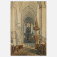 vom Licht durchfluteter gotischer Kirchenraum mit Priester und einigen Gläubigen, Aquarell, Mitte 19. Jh., rechts unten signiert und bezeichnet "E. Hasse fec.", unter Passepartout und hinter Glas gerahmt, Passepartoutausschnitt ca. 29,5 x 20,5 cm. Künstlerinfo: auch Haße, dt. Lithograph, Tier-, Landschafts- und Genremaler (1819 Erfurt bis 1860 Dresden), studierte ab 1837–41 an der Akademie in Dresden bei Ludwig Richter, ab 1848 ständig in Dresden ansässig, unternahm Studienreisen ins Rhonetal und nach Spanien, vertreten u. a. im Kupferstichkabinett Dresden und in der Sammlung von König Friedrich August II. von Sachsen, Quelle: Thieme-Becker, Friedrich „Ludwig Richter und seine Schüler“ und Internet.