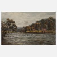 Blick über einen dahinfließenden Fluss auf das gegenüberliegende Ufer, unter locker bewölktem Himmel, Aquarell und Deckweiß, um 1870, links unten signiert "R. P. Richards", unter Passepartout und hinter Glas gerahmt, Passepartoutausschnitt ca. 27,5 x 44 cm. Künstlerinfo: engl. Landschafts- und Genremaler (1840 Liverpool bis 1877 Pisa), Quelle: Thieme-Becker.