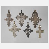 Äthiopien, Mitte 20. Jh., sechs Stück, Metallguss, meist durchbrochen gearbeitet und ornamental verziert, Altersspuren, H max. 7 cm.