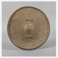 Somalia, um 1900, kreisförmiges Schild aus Leder, verziert von geometrischen Motiven, Mitte und Kante leicht erhöht, rückseitig mit stabilem Griff, guter altersgemäßer Zustand, D 32,5 cm.
