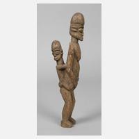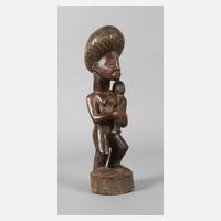 Angola, 2. Hälfte 20. Jh., der Volksgruppe der Tschokwe zugeordnet, Hartholz beschnitzt, vollplastische Darstellung einer Mutter mit Kind, H 36 cm.