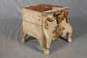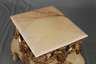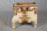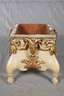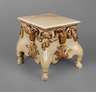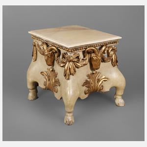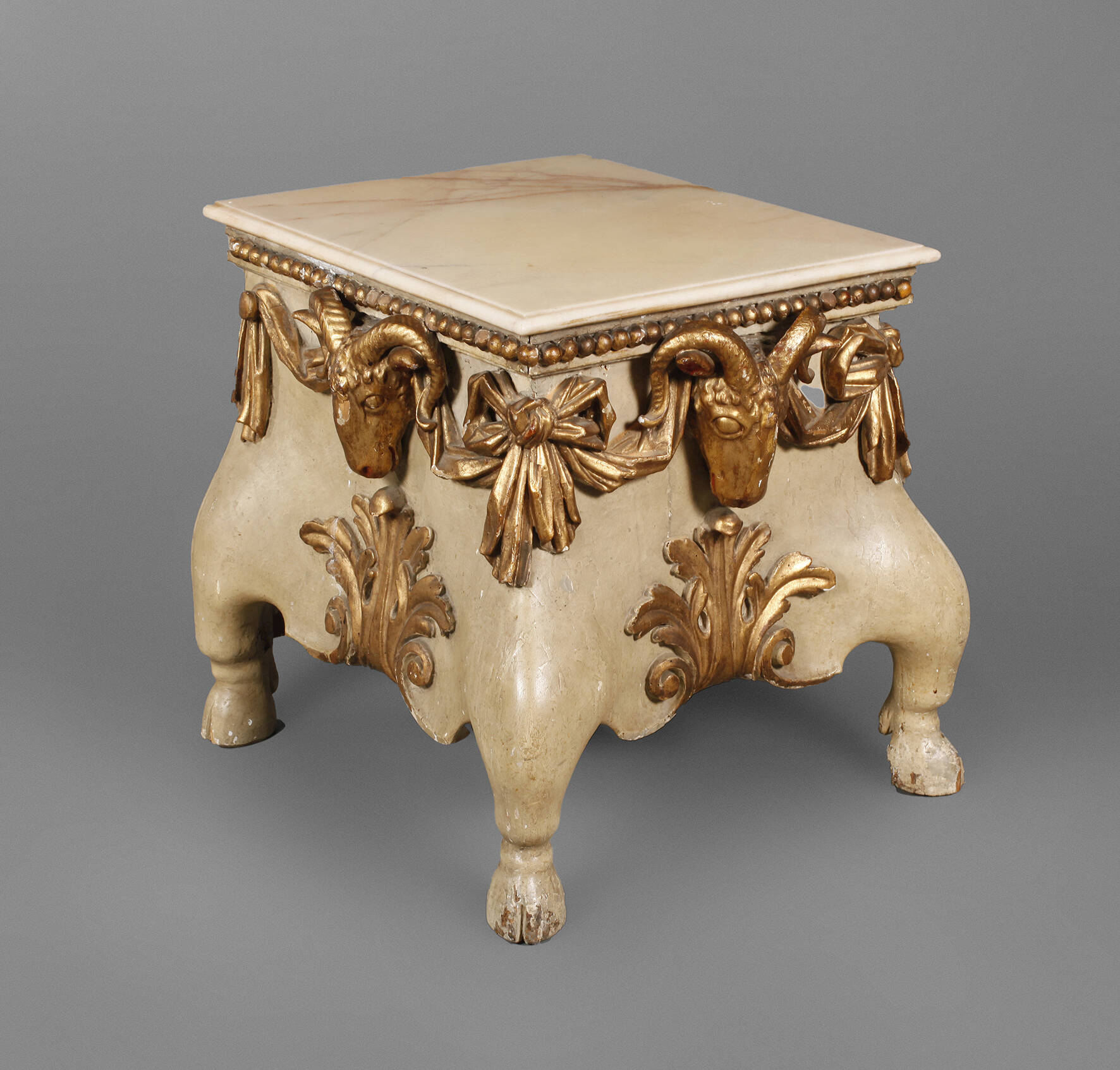 2. Hälfte 18. Jh., Holz geschnitzt, kreidegrundiert, cremefarben gefasst und vergoldet, auf drei Seiten verziert mit geschnitzten Widderköpfen, Festons und Akanthusblättern, die Wandung stark bombiert, die Füße als Bocksbeine gearbeitet, Marmorplatte ergänzt, Alters- und Gebrauchsspuren, rest.bed., Maße 59 x 57 x 60 cm.