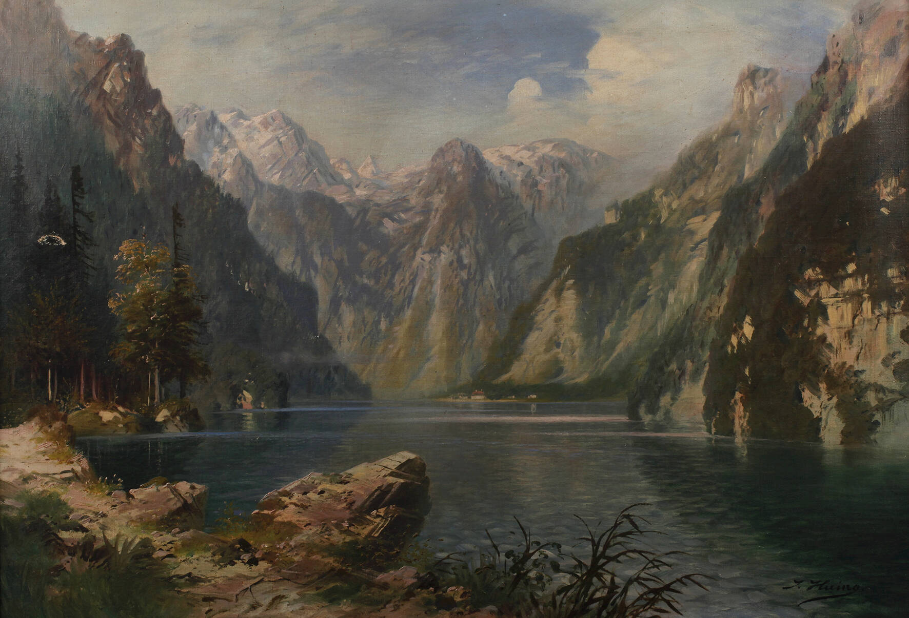 sommerlicher Blick vom Malerwinkel über den Königssee in Richtung St. Bartholomä, gering pastose Landschaftsmalerei mit lockerem Pinselduktus, Öl auf Leinwand, um 1930, rechts unten signiert "J. Hering", rückseitig altes Kunsthandlungsetikett "Galerie Del Vecchio – Leipzig – No. 7288", Fehlstelle in der Leinwand, restaurierungsbedürftig, beigegeben Originalrechnung der Leipziger Galerie Pietro Del Vecchio vom 28.10.1932, original gerahmt (defekt), Falzmaße ca. 70,5 x 100 cm. Künstlerinfo: eigentlich Johannes Hering, auch Hans Hering, dt. Landschaftsmaler, Gebrauchsgraphiker und Zeichenlehrer (1875 Lützen bis 1938), Privatschüler von Ludwig Schmid-Reutte in München, studierte ab 1896 an der Akademie München bei Karl Raupp, danach Privatschüler von Heinrich Heidner in München, Weiterbildung an der Akademie Berlin, fand seine Motive vornehmlich in den Alpen, tätig in Halle an der Saale, Quelle: Vollmer, Saur "Bio-Bibliographisches Künstlerlexikon", Dressler, Matrikel der Münchner Akademie und Internet.
