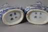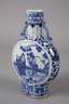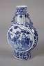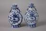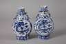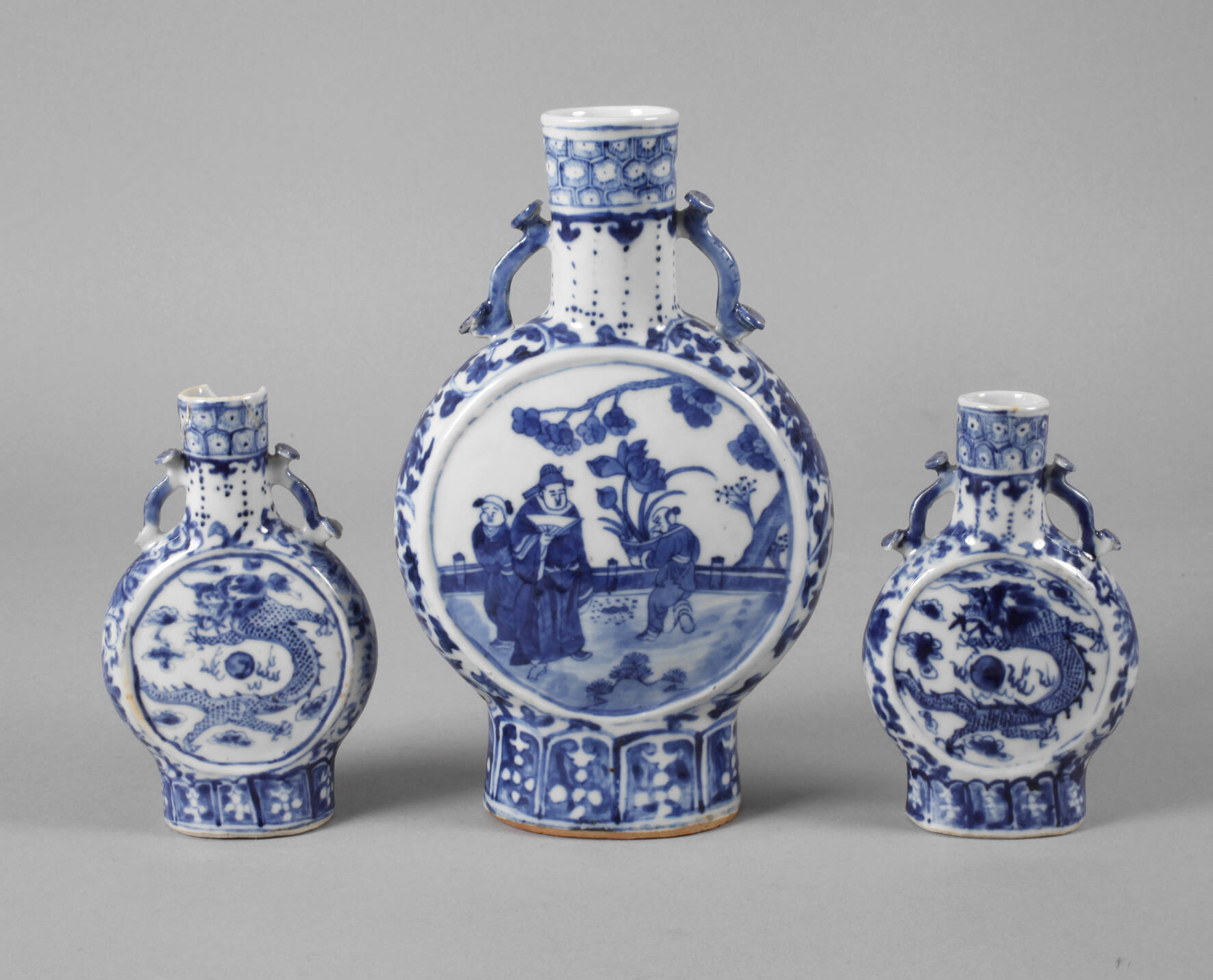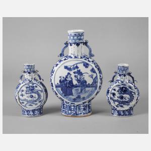 19. Jh., alle gemarkt, Porzellan in kobaltblauer Unterglasurbemalung, flache Korpora mit zylindrischem Hals und je zwei angedeuteten Handhaben, Front und Rückseite verziert von Drachenmotiv bzw. figürliche Darstellungen im Tondo, ein Hals alt repariert, mit größerem Ausbruch, sonst normale Altersspuren, H max. 27 cm.