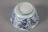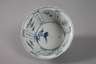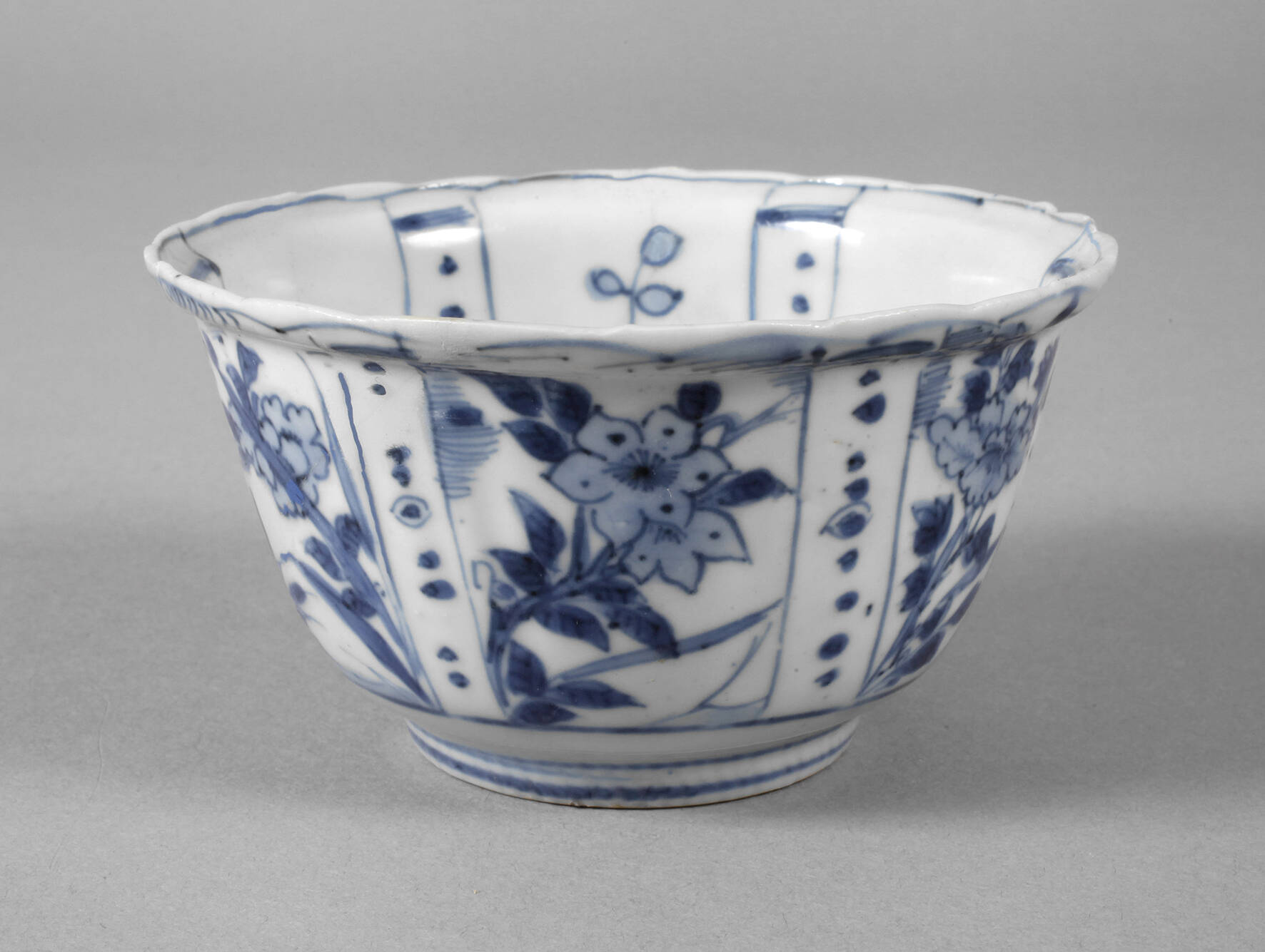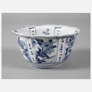 wohl Wanli-Periode, 17. Jh., ungemarkt, Eierschalenporzellan in kobaltblauer Unterglasurbemalung, flacher Rundstand, tief gemuldete Schale mit geschweifter Mündung, im Spiegel Vogelmotiv, die Wandung alternierend mit Pünktchendekor und Floralmotiven verziert, brandfleckig und partiell brandrissig, winzigst bestoßen, D 11,5 cm.