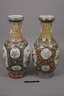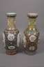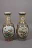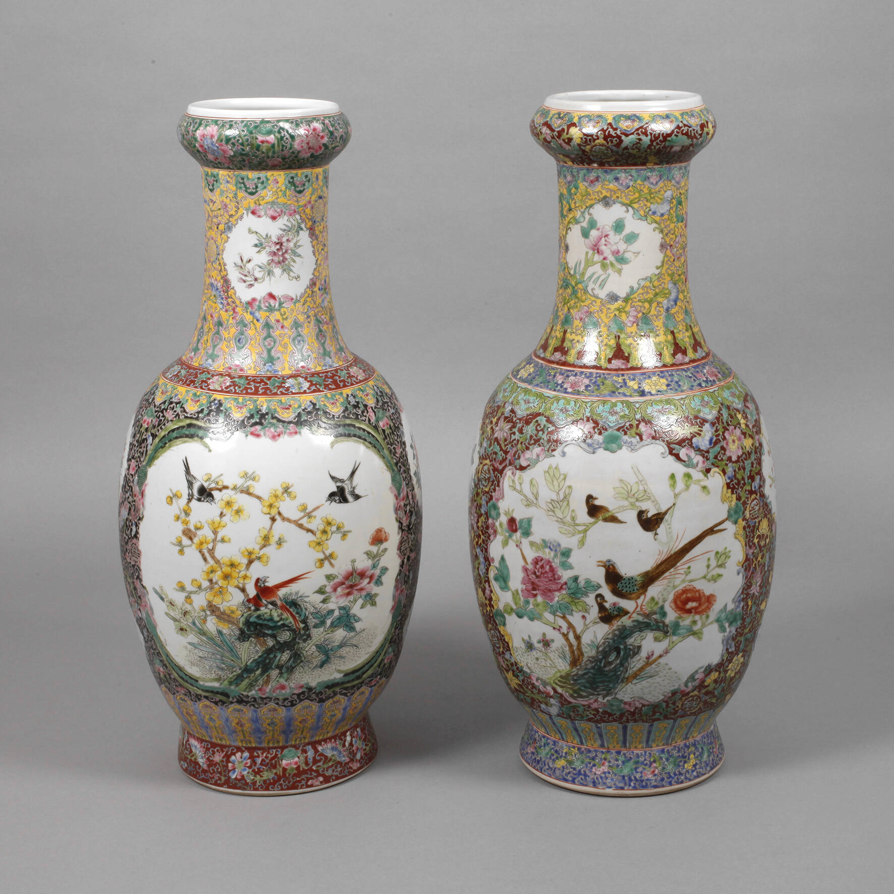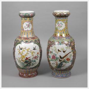 Mitte 20. Jh., am Boden mit roter Stempelmarke, Porzellan in polychromer Emailbemalung, gebauchte Korpora mit schlanken zylindrischen Hälsen, leicht konisch zulaufend und mit ausgestülpter Mündung, Vorder- und Rückseite zeigen in großen Kartuschen Vogeldarstellungen zwischen Blütenzweigen, gerahmt von üppiger Ornamentik, mannigfachem Rankwerk und Glückssymbolik, min. brandfleckig, etwas berieben, sonst gute Erhaltung, H je 58 cm.