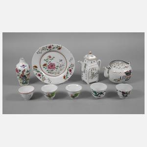 Anfang 20. Jh., insgesamt neun Teile, Porzellan in polychromer Aufglasurbemalung, teilweise gemarkt, dabei zwei Teekannen, Zierteller, Keulenvase und fünf Koppchen, unterschiedliche Maße und Erhaltungen, L max. 23 cm.