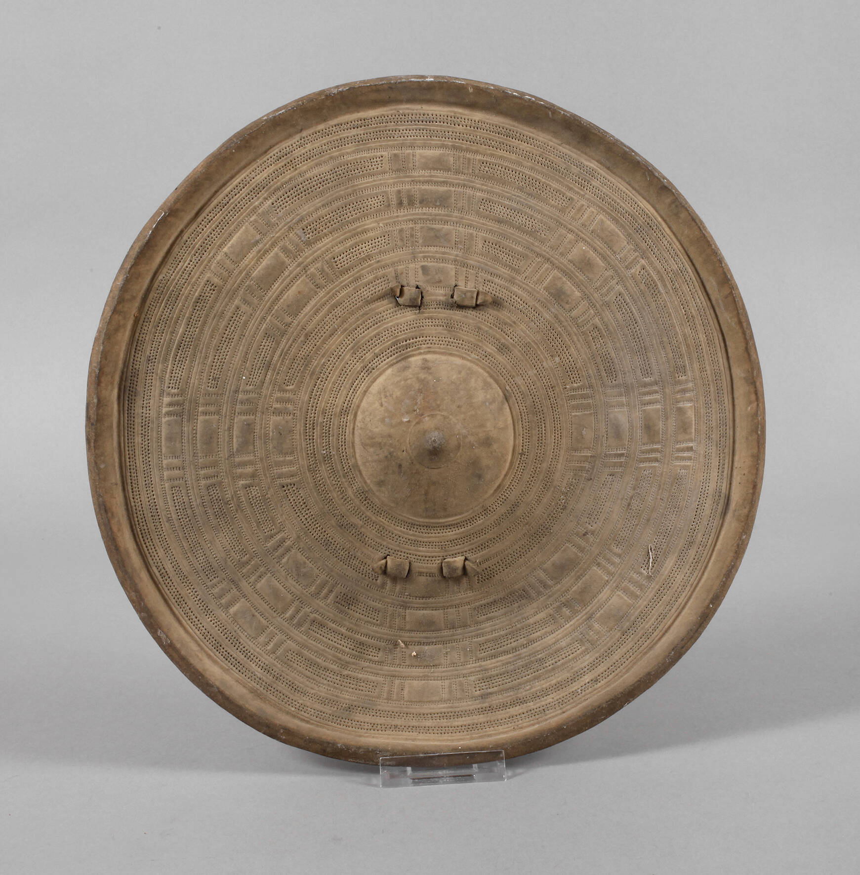 Somalia, um 1900, kreisförmiges Schild aus Leder, verziert von geometrischen Motiven, Mitte und Kante leicht erhöht, rückseitig mit stabilem Griff, guter altersgemäßer Zustand, D 32,5 cm.