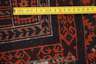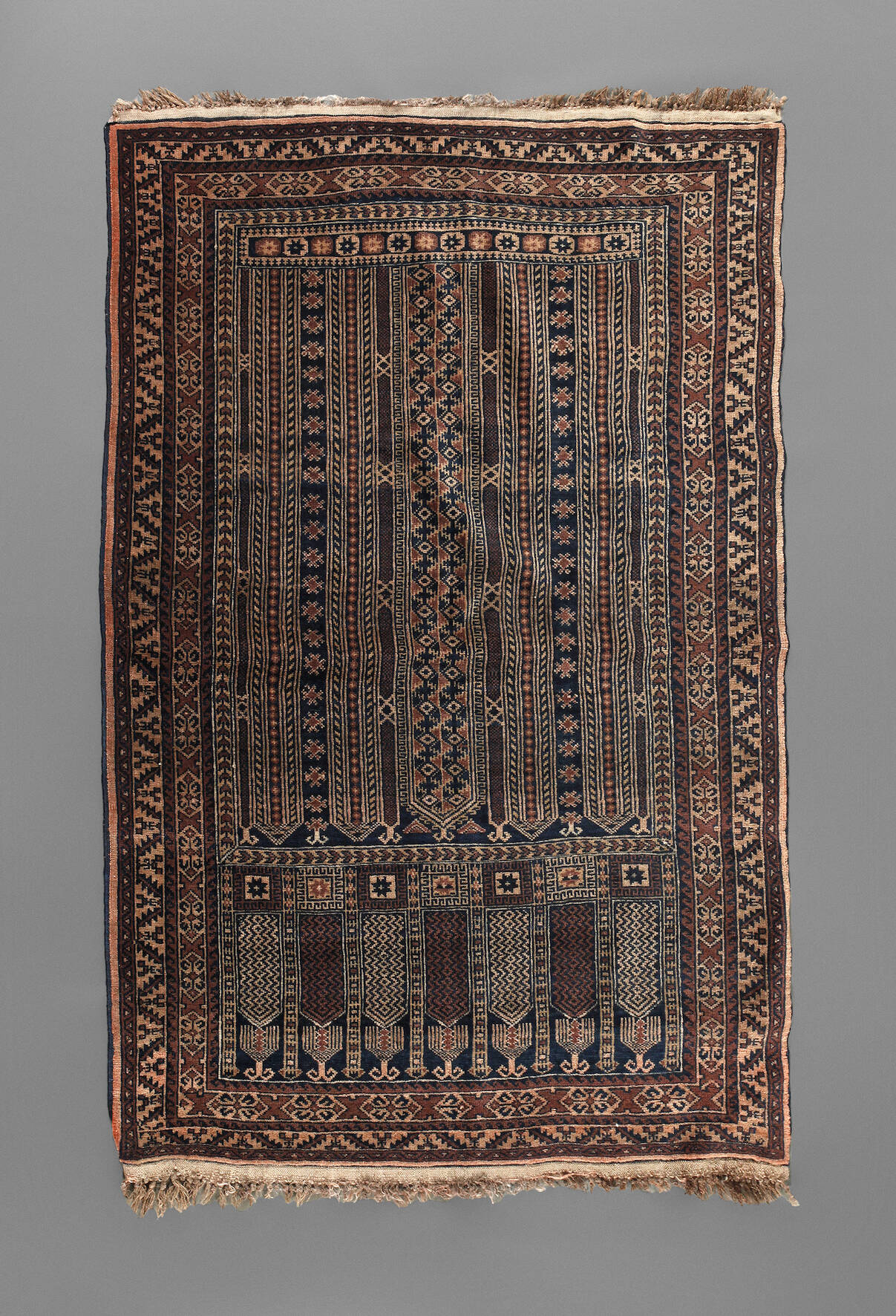 2. Hälfte 20. Jh., das dunkelblaue Mittelfeld verziert von Band- und Pfeilornamenten, durchsetzt von stilisierten Blüten, gerahmt von mehrteiliger Bordüre, Fransenbesatz gekürzt, leichte Altersspuren, Maße ca. 150 x 97 cm.
