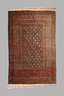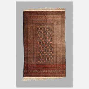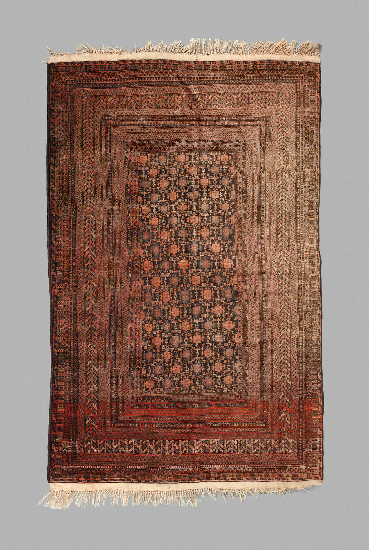 1. Hälfte 20. Jh., im Innenfeld mit rapportierenden Sternmotiven, gerahmt von unzähligen Bordüren mit unterschiedlichsten Ornamenten, Schmalseiten gekürzt, Ablaufspuren, Verfärbungen, Maße 129 x 200 cm.