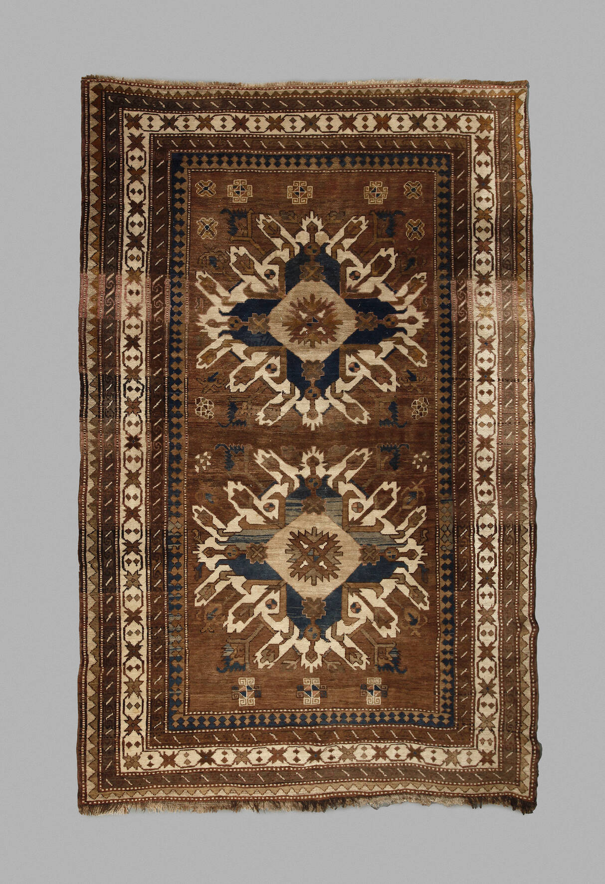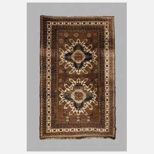 Mitte 20. Jh., in Erdtönen gestaltetes Modell mit zwei zentralen Medaillons, gerahmt von mehreren Bordürenbändern, Schmalseiten gekürzt, etwas verblasst, Maße 163 x 270 cm.