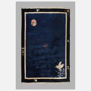 Mitte 20. Jh., Schurwolle, Kette und Schuss Baumwolle, handgeknüpftes Modell von dunklem Kolorit, in cremeweiß abgesetzt, mit traditionellem Dekor, welches minimalistisch Vogelmotive und Glückssymbolik zeigt, mittig retuschierte Stelle, sonst gute Erhaltung mit leichten Altersspuren, Maße ca. 395 x 295 cm.