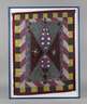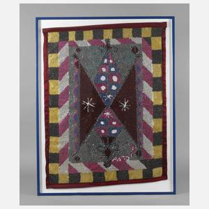 um 1970, im Motiv rechts unten undeutlich monogrammiert und datiert (wohl PN 70), hochrechteckige geometrische Stickerei aus Pailletten und Glasperlen in kräftigem Kolorit, begrenzt von bordeauxroter Seidenborte, frei hinter Glas gerahmt, rückseitig Rahmungsetikett Manfred Otto Frankfurt a. M., guter Zustand, Maße max. 98 x 77 cm.